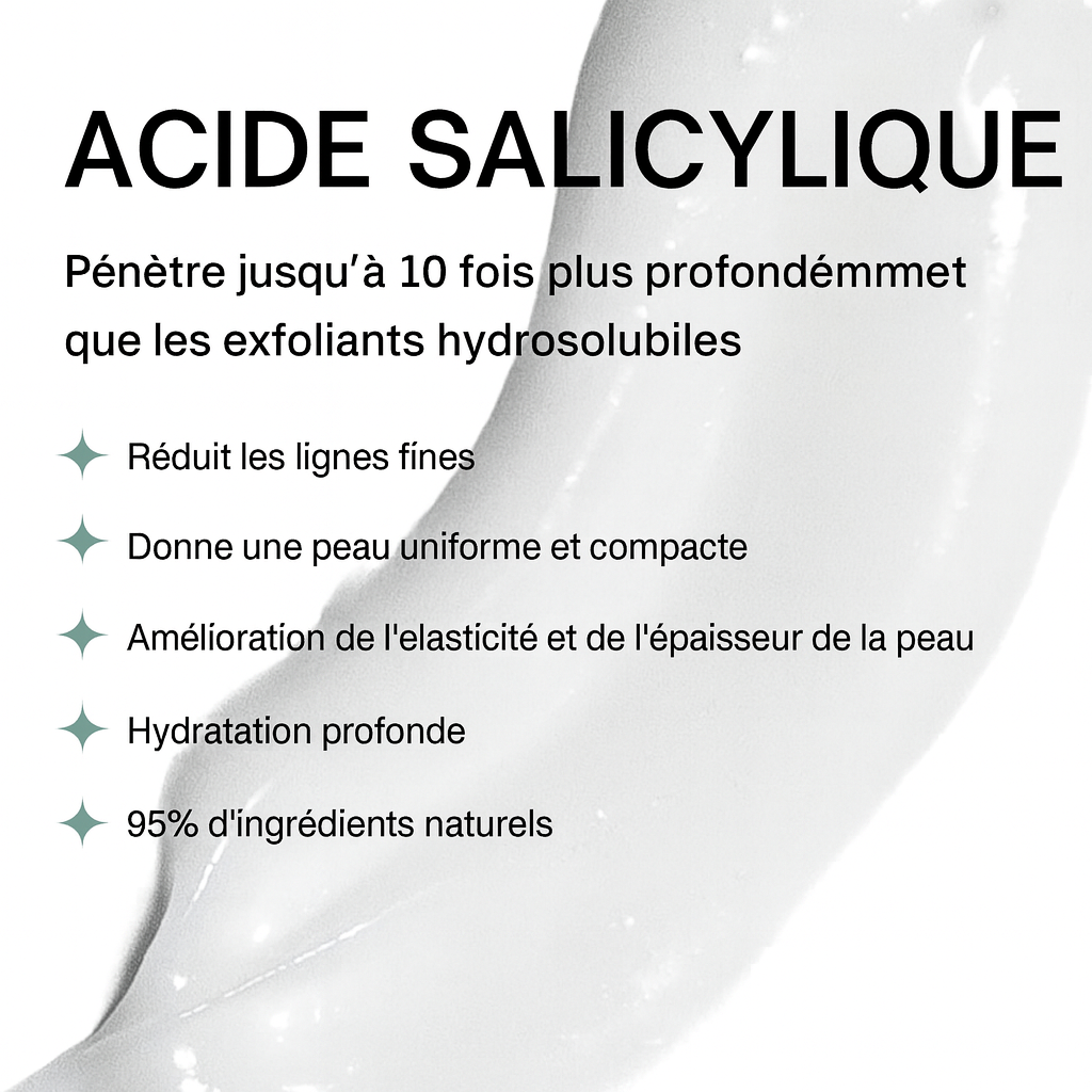 Acido salicilico e niacinamide: rinnovamento cellulare, uniformità del tono cutaneo e stimolazione del collagene per una pelle visibilmente più tonica.